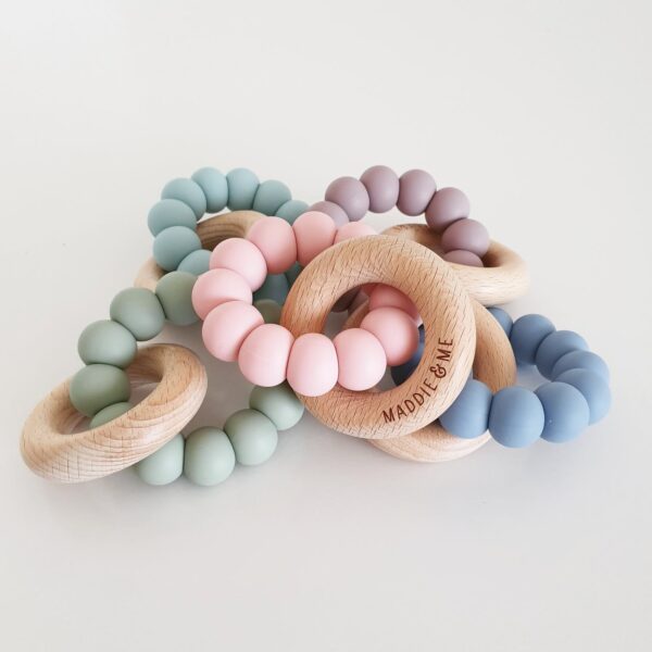 Our Bay Silicone and Beech Wood Ring Teethers are made from Food Grade silicone and are free from BPA, Lead, Cadmium, Phthalates, PVC and Latex! They do not support the growth of mould or bacteria. Silicone is a great sensory material and is soft on sore gums. Beech wood is naturally anti-bacterial.